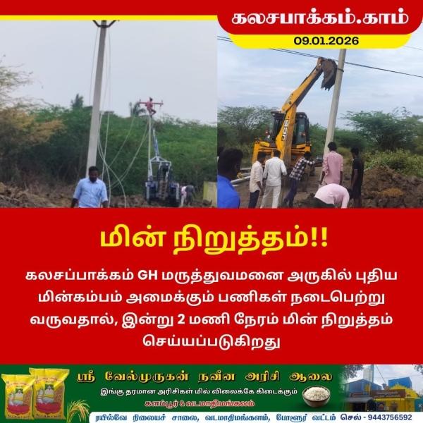 கலசபாக்கம் GH மருத்துவமனை அருகில் புதிய மின்கம்பம் அமைக்கும் பணிகள் நடைபெற்று வருவதால், இன்று 2 மணி நேரம் மின் நிறுத்தம் செய்யப்படுகிறது.