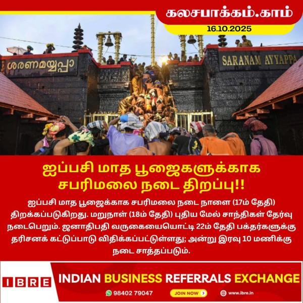 ஐப்பசி மாத பூஜைக்காக சபரிமலை நடை நாளை (17ம் தேதி) திறக்கப்படுகிறது. மறுநாள் (18ம் தேதி) புதிய மேல் சாந்திகள் தேர்வு நடைபெறும். ஜனாதிபதி வருகையையொட்டி 22ம் தேதி பக்தர்களுக்கு தரிசனக் கட்டுப்பாடு விதிக்கப்பட்டுள்ளது.…