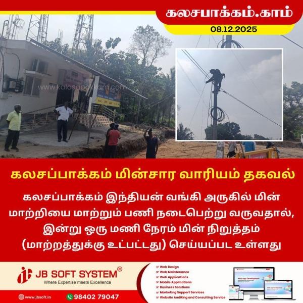 கலசபாக்கம் இந்தியன் வங்கி அருகில் மின் மாற்றியை மாற்றும் பணி நடைபெற்று வருவதால், இன்று ஒரு மணி நேரம் மின் நிறுத்தம் (மாற்றத்துக்கு உட்பட்டது) செய்யப்பட உள்ளது.