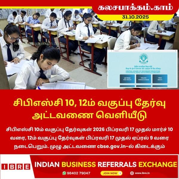 சிபிஎஸ்சி 10ம் வகுப்பு தேர்வுகள் 2026 பிப்ரவரி 17 முதல் மார்ச் 10 வரை, 12ம் வகுப்பு தேர்வுகள் பிப்ரவரி 17 முதல் ஏப்ரல் 9 வரை நடைபெறும். முழு அட்டவணை cbse.gov.in-ல் கிடைக்கும்.