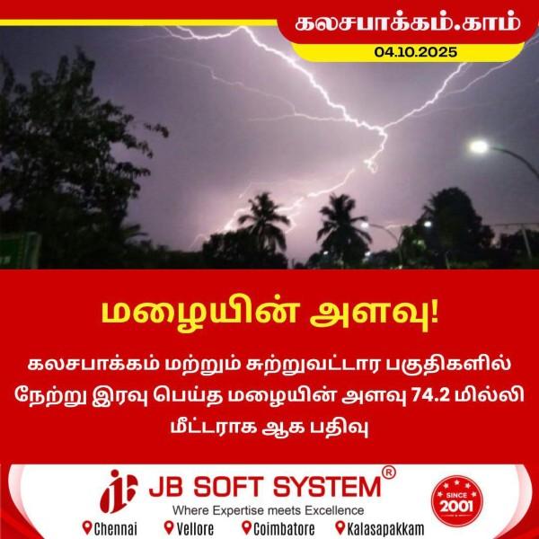 கலசபாக்கம் மற்றும் சுற்றுவட்டார பகுதிகளில் நேற்று இரவு பெய்த மழையின் அளவு 74.2 மில்லி மீட்டராக ஆக பதிவு ஆகியுள்ளது.