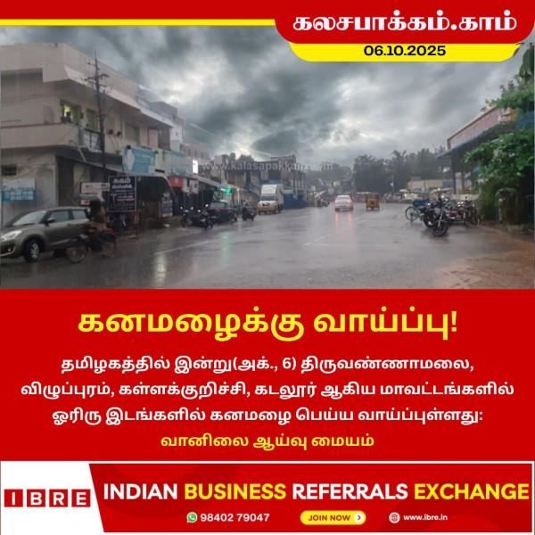 தமிழகத்தில் இன்று (அக்டோபர் 6, 2025) திருவண்ணாமலை, விழுப்புரம், கள்ளக்குறிச்சி, கடலூர் ஆகிய மாவட்டங்களில் ஓரிரு இடங்களில் கனமழை பெய்ய வாய்ப்புள்ளதாக வானிலை ஆய்வு மையம் அறிவித்துள்ளது.