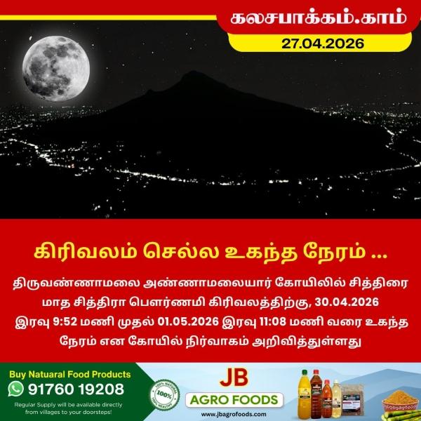 திருவண்ணாமலை அண்ணாமலையார் கோயிலில் சித்திரை மாத சித்திரா பௌர்ணமி கிரிவலத்திற்கு 30.04.2026 இரவு 9:52 மணி முதல் 01.05.2026 இரவு 11:08 மணி வரை உகந்த நேரம் என கோயில் நிர்வாகம் அறிவித்துள்ளது.