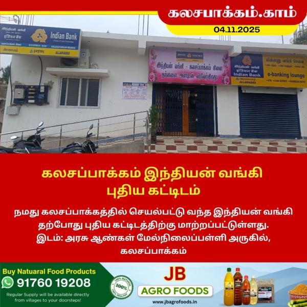 நமது கலசபாக்கத்தில் செயல்பட்டு வந்த இந்தியன் வங்கி தற்போது புதிய கட்டிடத்திற்கு மாற்றப்பட்டுள்ளது.