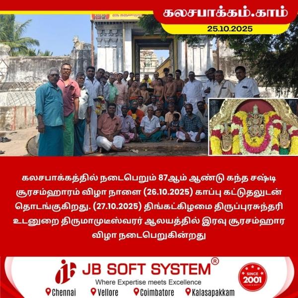 கலசபாக்கத்தில் நடைபெறும் 87ஆம் ஆண்டு கந்த சஷ்டி சூரசம்ஹாரம் விழா நாளை (26.10.2025) காப்பு கட்டுதலுடன் தொடங்குகிறது. (27.10.2025) திங்கட்கிழமை திருப்புரசுந்தரி உடனுறை திருமாமுடீஸ்வரர் ஆலயத்தில் இரவு சூரசம்ஹார விழா நடைபெறுகின்றது.