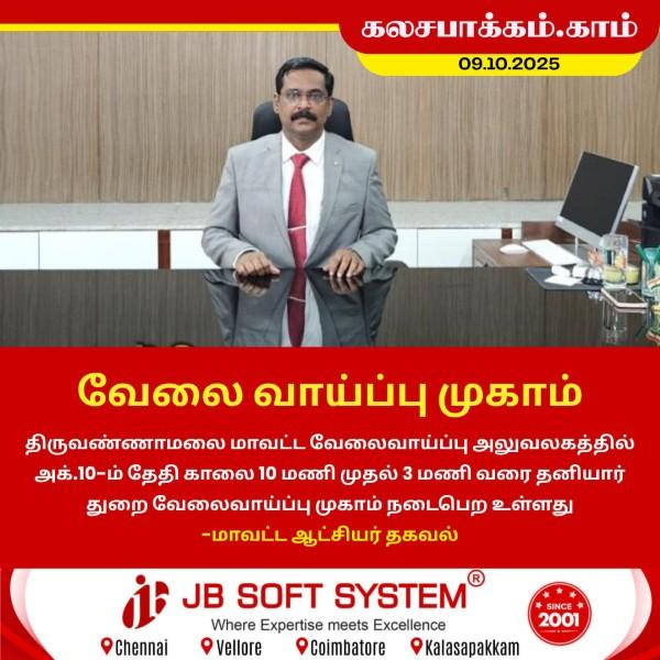 திருவண்ணாமலை மாவட்ட வேலைவாய்ப்பு அலுவலகத்தில் வரும் அக்டோபர் 10, 2025 அன்று காலை 10 மணி முதல் மதியம் 3 மணி வரை தனியார் துறை வேலைவாய்ப்பு முகாம் நடைபெறவுள்ளது. இதில் பல்வேறு நிறுவனங்கள் பங்கேற்க உள்ளன. வேலையிழந்த இளைஞர்கள் தங்களின் கல்வித்…