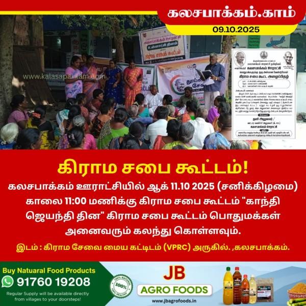 கலசபாக்கம் ஊராட்சியில் ஆக் 11.10 2025 (சனிக்கிழமை) காலை 11:00 மணிக்கு கிராம சபை கூட்டம் “காந்தி ஜெயந்தி தின” கிராம சபை கூட்டம் பொதுமக்கள் அனைவரும் கலந்து கொள்ளவும். இடம் : கிராம…