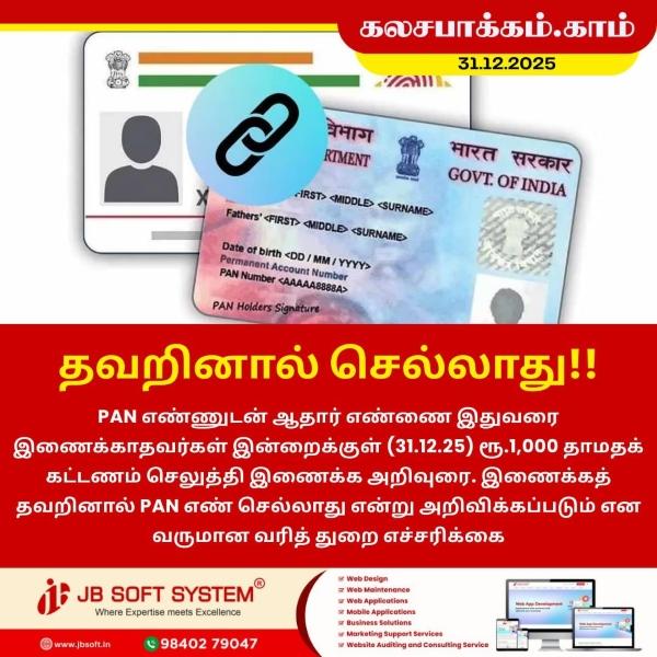 PAN எண்ணுடன் ஆதார் எண்ணை இதுவரை இணைக்காதவர்கள் இன்றைக்குள் (31.12.25) ரூ.1,000 தாமதக் கட்டணம் செலுத்தி இணைக்க அறிவுரை. இணைக்கத் தவறினால் PAN எண் செல்லாது என்று அறிவிக்கப்படும் என வருமான வரித் துறை எச்சரிக்கை விடுக்கப்பட்டுள்ளது.