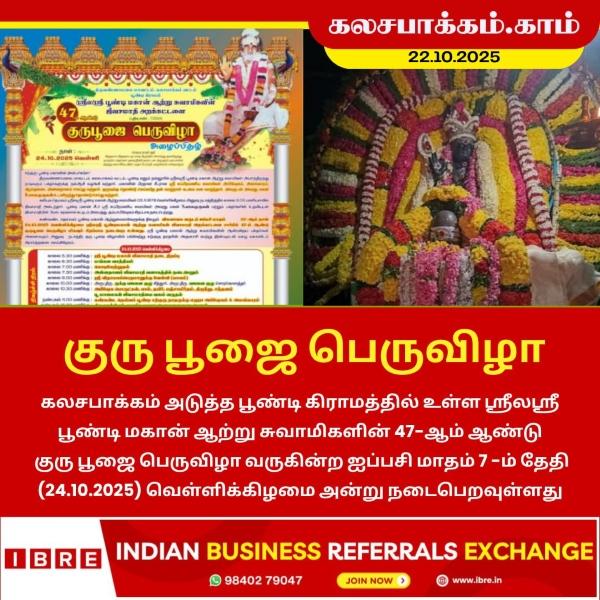 கலசபாக்கம் அடுத்த பூண்டி கிராமத்தில் உள்ள ஸ்ரீலஸ்ரீ பூண்டி மகான் ஆற்று சுவாமிகளின் 47-ஆம் ஆண்டு குரு பூஜை பெருவிழா வருகின்ற ஐப்பசி மாதம் 7-ம் தேதி (24.10.2025) வெள்ளிக்கிழமை அன்று நடைபெறவுள்ளது.