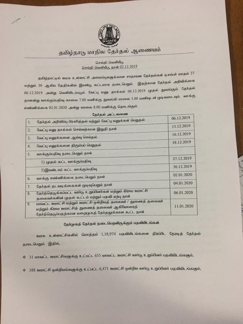 வேட்புமனு தாக்கல் செய்ய இறுதிநாள் டிசம்பர் 13-ஆம் தேதியும், வேட்புமனு ஆய்வு 16-ஆம் தேதியும், வேட்புமனு திரும்பப்பெறுவது 18-ஆம் தேதியும் நடைபெறும். வாக்குப்பதிவு காலை 7 மணி தொடங்கி மாலை 5 மணி வரை நடைபெறும். வாக்கு எண்ணிக்கை 02.1.2020-ஆம் தேதி காலை 8 மணிக்கு தொடங்கி நடைபெறும்.