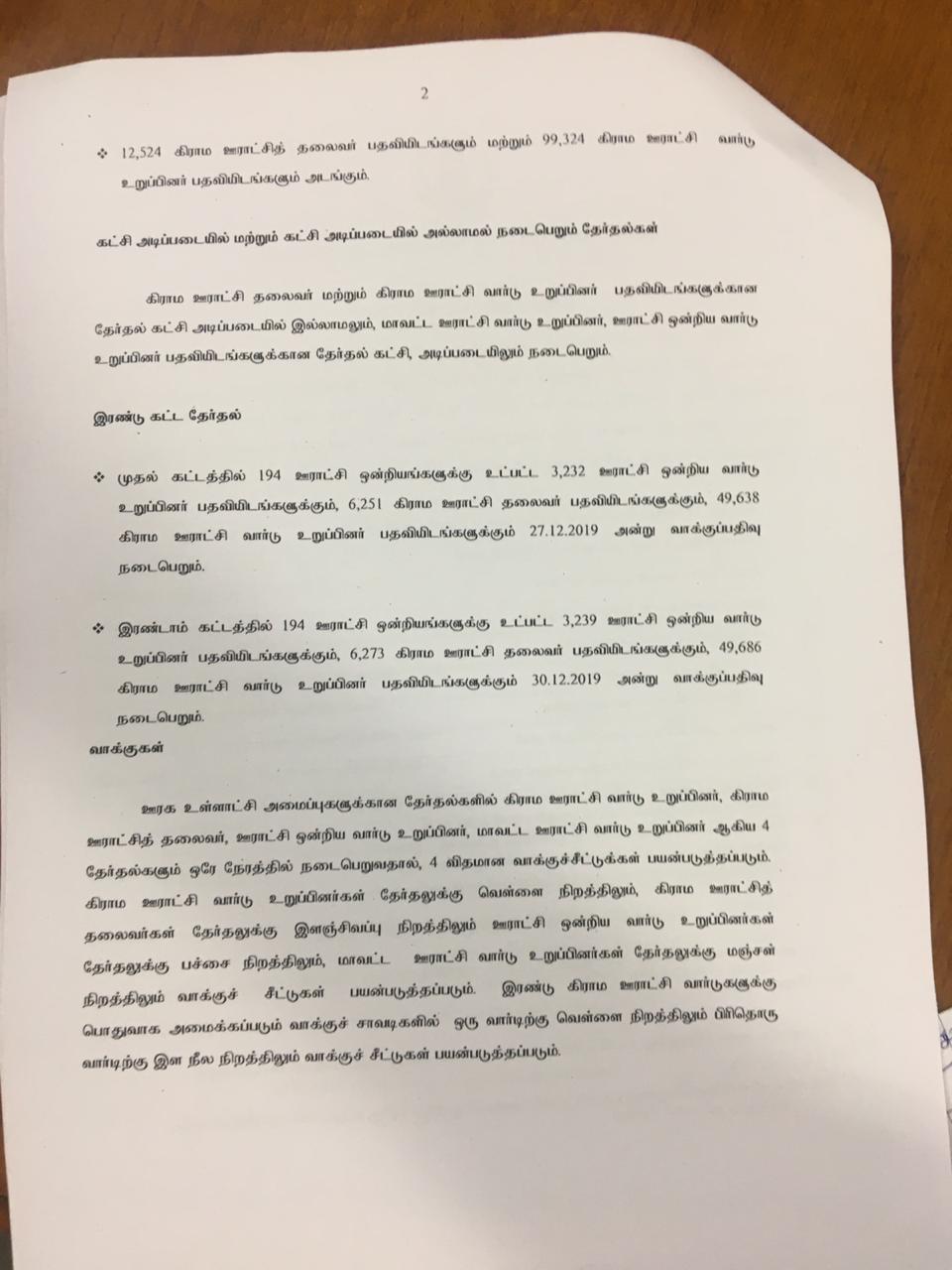 ஊரக உள்ளாட்சி அமைப்புகளுக்கான தேர்தல் டிசம்பர் 27 மற்றும் 30 ஆகிய தேதிகளில் 2 கட்டங்களாக நடத்தப்படும். இதற்கான தேர்தல் அறிவிக்கை டிசம்பர் 06-ஆம் தேதி வெளியிடப்படும், மேலும் அன்றைய தினம் முதல் வேட்புமனு தாக்கல் தொடங்கப்படும்.