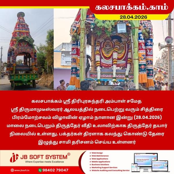 கலசபாக்கம் ஸ்ரீ திரிபுரசுந்தரி அம்பாள் சமேத ஸ்ரீ திருமாமுடீஸ்வரர் ஆலயத்தில் நடைபெற்று வரும் சித்திரை பிரம்மோற்சவம் விழாவின் ஏழாம் நாளான இன்று (28.04.2026) மாலை நடைபெறும் திருத்தேர் வீதி உலாவிற்காக திருத்தேர் தயார் நிலையில் உள்ளது. பக்தர்கள் திரளாக கலந்து கொண்டு தேரை இழுத்து சாமி தரிசனம் செய்ய உள்ளனர்