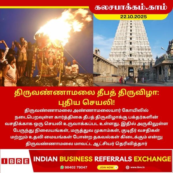 திருவண்ணாமலை அண்ணாமலையார் கோயிலில் நடைபெறவுள்ள கார்த்திகை தீபத் திருவிழாக்கு பக்தர்களின் வசதிக்காக ஒரு செயலி உருவாக்கப்பட உள்ளது. இதில் அருகிலுள்ள பேருந்து நிலையங்கள், மருத்துவ முகாம்கள், குடிநீர் வசதிகள் மற்றும் உதவி மையங்கள் போன்ற தகவல்கள் கிடைக்கும் என்று திருவண்ணாமலை மாவட்ட ஆட்சியர் தெரிவித்தார்.