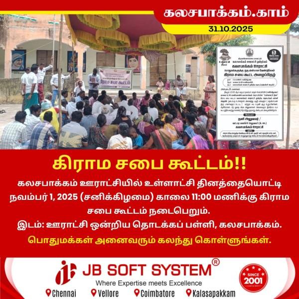 கலசபாக்கம் ஊராட்சியில் உள்ளாட்சி தினத்தையொட்டி நவம்பர் 1, 2025 (சனிக்கிழமை) காலை 11:00 மணிக்கு கிராம சபை கூட்டம் நடைபெறும். இடம்: ஊராட்சி ஒன்றிய தொடக்கப் பள்ளி, கலசபாக்கம். பொதுமக்கள் அனைவரும் கலந்து கொள்ளுங்கள்!