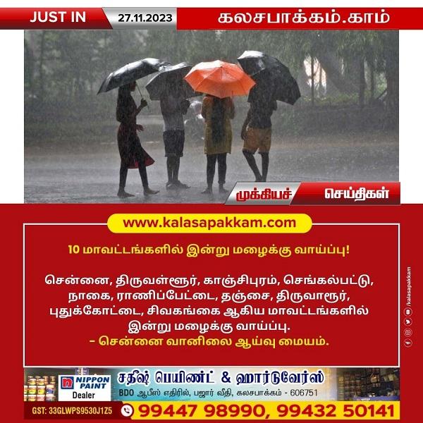 செங்கல்பட்டு, ராணிப்பேட்டை, வேலூர், காஞ்சிபுரம், திருவண்ணாமலை, கள்ளக்குறிச்சி, விழுப்புரத்தில் கனமழைக்கு வாய்ப்பு; சென்னையில் அடுத்த 2 நாட்களுக்கு மிதமான மழைக்கு வாய்ப்பு – சென்னை வானிலை ஆய்வு மையம்.