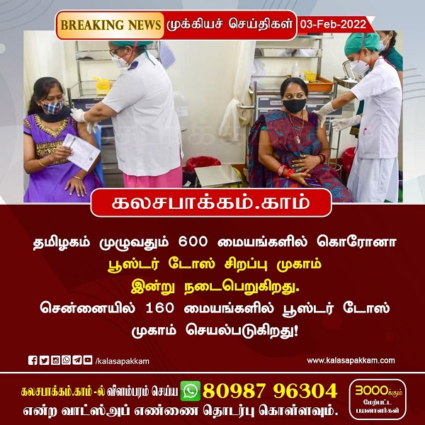 தமிழகம் முழுவதும் 600 மையங்களில் கொரோனா பூஸ்டர் டோஸ் சிறப்பு முகாம் இன்று நடைபெறுகிறது.