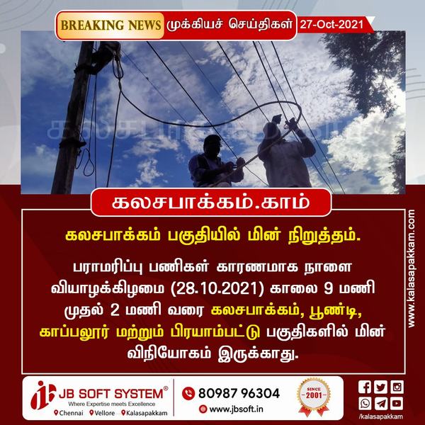 பராமரிப்பு பணிக்கான வியாழக்கிழமை (28.10.2021) காலை 9மணி முதல் 2 மணி வரை கலசபாக்கம், பூண்டி,காப்பலூர் மற்றும் பிரயாம்பட்டு பகுதிகளில் மின் விநியோகம் இருக்காது.