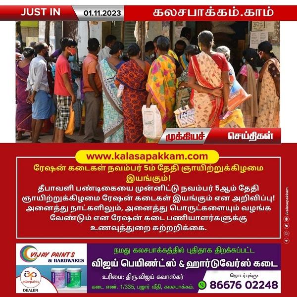 தீபாவளி பண்டிகையை முன்னிட்டு நவம்பர் 5ஆம் தேதி ஞாயிற்றுக்கிழமை ரேஷன் கடைகள் இயங்கும் என அறிவித்துள்ளது. அனைத்து நாட்களிலும், அனைத்து பொருட்களையும் வழங்க வேண்டும் என ரேஷன் கடை பணியாளர்களுக்கு உணவுத்துறை சுற்றறிக்கை.