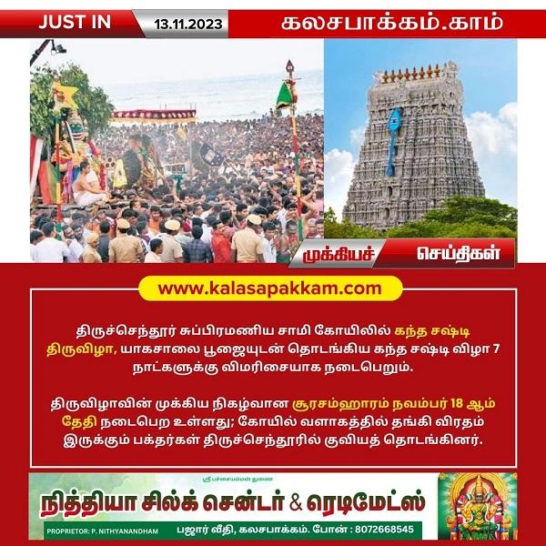 திருச்செந்தூர் சுப்பிரமணிய சாமி கோயிலில் கந்த சஷ்டி திருவிழா, யாகசாலை பூஜையுடன் தொடங்கிய கந்த சஷ்டி விழா 7 நாட்களுக்கு விமரிசையாக நடைபெறும். திருவிழாவின் முக்கிய நிகழ்வான சூரசம்ஹாரம் நவம்பர் 18 ஆம் தேதி நடைபெற உள்ளது; கோயில் வளாகத்தில் தங்கி விரதம் இருக்கும் பக்தர்கள் திருச்செந்தூரில் குவியத் தொடங்கினர்.